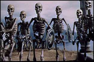• In a memorable film example, Ray Harryhausen's animated skeletons make up half of a Chroma Key battle scene in Jason and the Argonauts, after they sprout from the earth where hydra teeth are sown. This depiction is likely to yet further simplify the original story by letting Jason kill apparently mindless Mooks, since in the original myths, the dragon's teeth grow into the perfectly sentient warriors called spartoi, none of whom Jason left alive.