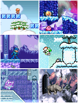 - The level "Awesome" in the Special Zone of Super Mario World; not only an outdoor ice level, but also the only outdoor ice level in the game. That aside, the trope is mostly averted in the game, though a few of the secret levels are ice caves.