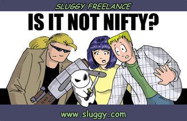 - Title Drop: A couple times - for instance, Torg and Riff were both freelancers when the strip began, and Riff's ID in Paradise is how to spell SLUGGY with a phone keypad.
