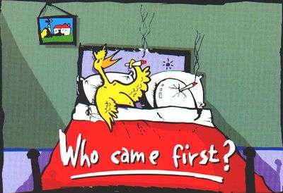- On the NPR radio show A Prairie Home Companion, Garrison Keillor once described a cartoon he saw that had a chicken and an egg lying in bed. The egg was somehow smoking a cigarette, and the caption read, "Well, I guess that answers that question." This has been drawn several times with slight variations. One version can be found at the bottom of this page.