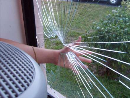- In Tosh.0, Tosh interviews a news reporter who had trouble breaking car door glass with a hammer. He gets it this time around, since the trick is to hit the corner of the car window. Hitting center of the window full-force with a tool designed to shatter said windows resulted in a loud noise and a tiny ding in the glass. However, when applied about an inch in from the corner, a swing from the wrist, not even elbow or shoulder, breaks the entire window.