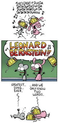 For the record, the lines immediately preceding in "It's The End Of The World As We Know It" are "The other night, I tripped a nice continental drift divide, Mount Saint Edelite"[2] It was difficult even for R.E.M. - Michael Stipe didn't finally memorize the lyrics to the song until around a decade after it first appeared on an album. He brought up a lyric sheet to do the song live before that, and there are several instances where he lost the sheet and had to make do... until he got to Something Something Leonard Bernstein.