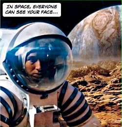 - In Space Everyone Can See Your Face: Eschews the usual stupid lights inside the helmet, but unfortunately also the metallic anti-radiation coating that renders real space-suit visors opaque from the outside.