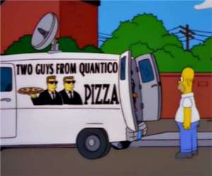 - The page image is from The Simpsons episode, "The Trouble With Trillions". The 'Two Guys from Quantico Pizza' van comes into play when Homer is press-ganged into helping an investigation of Mr Burns.