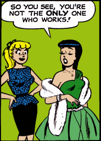 - Like the picture above, Veronica from Archie Comics wants to get a job like all her friends have, but she's just not motivated enough to actually apply for one. In one comic chapter, everyone is busy with their summer jobs... except Veronica. She has no siblings (that we see, anyway), and her parents are busy running the family corporate empire, so she's pretty much alone and already bored with the empty days of summer vacation. She wished she had something to do, even a job, because this boredom is driving her crazy. Archie eventually comes by and visits, telling her about this one position open at the jewelry shop in the nearby mall. He says this position would be perfect for her, since she wears so much of it. Veronica looks like she's going to accept... then decides not to, because she's so wealthy she doesn't need to work. Apparently, having loads of money means one can never get an actual job, even if it's just to pass the time.