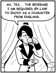 - In Girl Genius, despite being (presumably) German or Austrian (going by the names), Gil built a construct when he was eight that makes tea (and is very concerned about Agatha stealing his job), and employs a British manservant/ who knows how Gil takes his tea. Agatha and the other inhabitants of Mechanicsburg seem to prefer coffee.