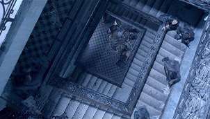 A Cinematography trope. A Pursued Protagonist is being chased up (less often, down) a stairwell. As they run up the camera "floats" upwards and we see the hero and his adversaries as they spiral upwards, or may well descend to show all the pursuers. The hero and the pursuers will look up and down at each other at least once before setting off running.