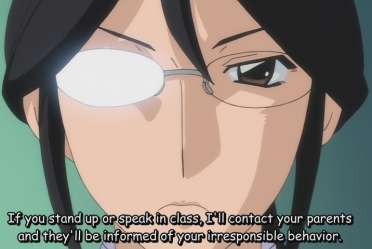 - Nitta of Mahou Sensei Negima is generally shown acting like this. It's partially subverted later on, as outside of class activities he's actually a pretty nice guy.