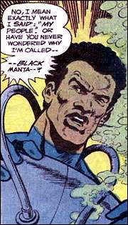 - In DC Comics, Black Manta was revealed to be black in 1977, ten years after his debut. Notably, he attempts to use his race to trick people into following him by claiming his actions against Aquaman were in an attempt to make Atlantis a paradise for minorities all along. This is, naturally, a total lie he used to personal gain, which amusingly still leads to the Aesop that all races are indeed equal: in that all of them are capable of producing jerks (further reinforced by the revelation that he suffers from a form of Autism, which is played as a Freudian Excuse prompting Aquaman to later magically cure him...and the first thing Black Manta does afterwards is stab Aquaman and brag about having murdered his infant son).