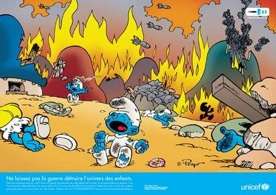 - The page picture is part of a UNICEF campaign in Belgium using The Smurfs to raise awareness of child soldiers in Africa. The full commercial is here. UNICEF had to run the advert late at night to avoid scarring any children for life with it. The words at the end are something to the effect of "Don't let war destroy the world of children."