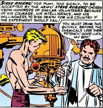 Power-Up Food is the case when the abilities come from common foodstuffs. Applied to enough people at once, and it becomes a Mass Super-Empowering Event. If (as in the case of Captain America (comics), pictured left) only one person gets it, it's a Disposable Superhero Maker. A Superhuman Transfusion (especially if it's from someone who drank Super Serum) usually has the same effects.
