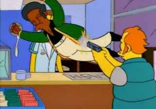 - Apu takes a bullet for James Woods, only to find it bounced off another bullet.