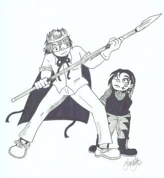 A picture of Trish and Mebby (The Starbuck Avenger and Corpseflower) by Shaenon Garrity.