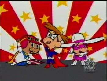 Teamo Supremo (2002-2004) was a Disney cartoon originally aired as part of Disney's One Saturday Morning right before its transition into ABC Kids, and was just as quickly shown in reruns on Toon Disney (and for a short while, the regular Disney Channel) when the channel was still showing Disney cartoons on a regular basis. It is a rather simple show about three ordinary schoolchildren named Crandall (center), Hector (left), and Brenda (right), who take on the secret identities of the eponymous crime-fighting trio to battle some stupid evildoers. As superheroes, they call themselves Captain Crandall, Skate Lad, and Rope Girl, respectively.