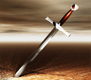 - In "Omens Part 2" The Sword of Omens falls this way after its wielder King Claudus is stabbed, embedding itself in a branch of a giant tree.