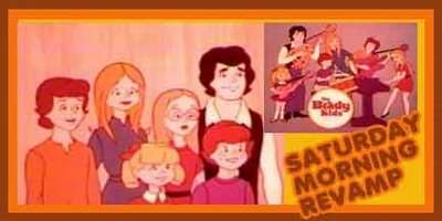 The Brady Kids was the Animated Adaptation of The Brady Bunch, produced by Filmation and originally airing from 1972 to 1974 on ABC. Most of the plot was about their misadventures and their songs. They had instruments, too: Greg and Peter on guitars, Bobby on drums, Marcia on tambourine and Jan on keyboards. Added was Cindy (in front of Greg) on a smaller guitar. Alice and the parents were missing from the series, and Tiger had been replaced by Moptop, a different dog. They also had two pet pandas that spoke nothing but Chinese-sounding gibberish and a magical myna bird. They had a musical performance Once an Episode, and encountered various different guest stars, from Wonder Woman (in her first animated appearance) to The Lone Ranger.