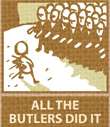 - One Avram Davidson story presents a (fictional) crime writer who first used the phrase "the butler did it," and subsequently made a great deal of money off of murderous butler stories. When he stumbles into Butler Afterlife, its inhabitants are inclined to kill him for defaming their profession.