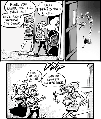 - Dexter's Laboratory had a pretty standard version of this one in the episode "The Continuum of Cartoon Fools", in which Deedee repeatedly found ways to get into Dexter's Lab, and only by figuring out the obvious entrance Deedee could use every time to get inside (the secret book case entrance) could Dexter seal her off once and for all. The kicker? He locked himself out of the lab. He then spends the last thirty seconds or so of the cartoon going on a tirade about how he's no better than "that crazy coyote or that stupid duck".