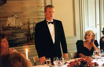 As guests arrive one-by-one, the action moves into the dining room where the celebration is about to begin. And then Christian stands up and prepares to make a speech. However, he gives his father a choice. Does he want a yellow speech or a green speech? After being coaxed by his guests, Helge settles on the green speech, which Christian has dubbed the "honest speech". Little idea does the guests have about what kind of dark family secrets that are going to see the light of day.