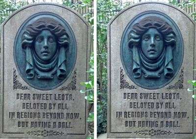 - A headstone for a woman named Leota, found right next to the entrance of The Haunted Mansion at Walt Disney World's Magic Kingdom, has what appears to be a bronze relief of a woman's face, with eyes closed, on it; if one watches it for long enough, her eyes open, her head moves, and she looks around before closing her eyes and going still again. See the page image.