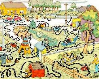 Rather than creating a multi-panel story, Family Circus Sunday strips often feature single drawings of long, meandering paths that one of the children took to achieve some end (the dotted lines also periodically show up in the daily "circle" panels as well, again denoting a path). It's been parodied rather frequently in other comics.
