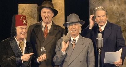 "No, no, no, no, no, no! You don't understand how radio works. Now, this is my flashback -- all I have to do to return us to the present is fade my voice out like this and cue the organist!" |