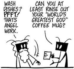 - Taken literally in Johnny the Homicidal Maniac, after Johnny dies. He ends up in heaven and meets God, depicted as a balding fat apathetic little gnome in a recliner, who explains that he created the universe and now needs some downtime.