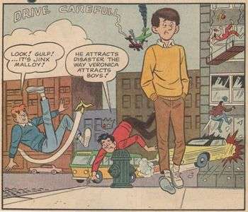- Jinx Malloy, a recurring character in Archie Comics (of the "causes bad luck in others" variety). He's so infamous in Riverdale that when he goes out, he wears disguises so no one will run away in terror at his approach.
