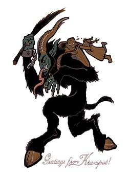 Krampus is an Alpine mountain Christmas demon who figures heavily in the Christmas traditions of Central Alpine Europe. According to legend, Krampus accompanies St. Nicholas during the early Christmas season. Depending on the story, Krampus is either a regular demon enslaved by St. Nicholas to do the Saint's bidding, or is a demon who willingly and gladly works as St. Nicholas's partner. Krampus acts as the Bad Cop to St. Nicholas's Good Cop, warning and punishing bad children into being good, in contrast to St. Nicholas, who instead rewards good children with simple, small gifts.