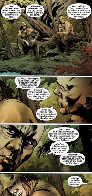 - Or rather, "I Am A Credit To My Race" -- Hawkeye constantly talks about how he, "a man without a cross" of American Indian blood, can nonetheless fight effectively among them. The American Indians mostly ignore the subject...
