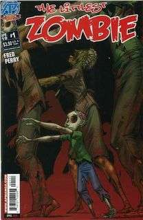 The Littlest Zombie is an Antarctic Press comic book from Gold Digger creator Fred Perry. It tells the story of a world ruined by nuclear warfare, where zombies now roam the Earth, looking for any survivors on whom to feed. Our protagonist is the titular unnamed zombie, who's doing his best to survive any way he can, though it's rather difficult when you're missing a foot and much bigger zombies get in your way.