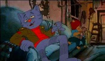 - Protagonist-Centered Morality: Fritz, a lovable cartoon cat, neglects his wife and son to smoke pot and imagines himself as a member of the Nazi party during World War II, and refers to black girls as knowing "where it's at by the time they're 11". Wait, what?