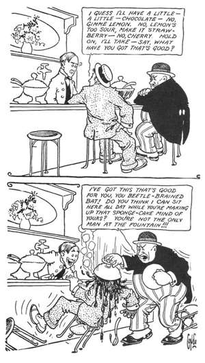 The simple setup just works, however, because all the situations are things people could relate to at the time, and many of them apply even today. For example, Everett is attending a baseball game when a group of men crowd him and say to him "Did you see that?" "Did you see that hit?" "You should have seen that!" He beats them up, saying "Yes, I saw that! And I'd love to see what's going on in the field right now if you'd all get out of my face!" Or Everett is being told by his doctor that he doesn't really have a medical problem and that he's just imagining the pain. In the next panel, Everett's beating up his doctor and telling him "This pain is all in your head. It's not really there. You're just imagining the pain."