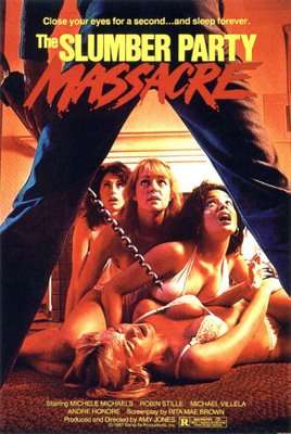 In The Slumber Party Massacre (1982), Serial Killer Russ Thorn escapes from the mental institution and terrorizes the partying girls and two sisters living nearby. It was written by feminist activist Rita Mae Brown, and it was supposed to be a spoof of the genre. Instead it was directed as a straight horror story, whose humor ranges from intentional to unintentional and with more Fan Service than any other slasher film from those days.