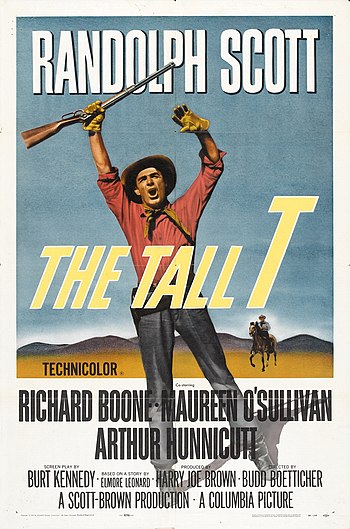 Randolph Scott stars in The Tall T, director Budd Boetticher's psychological western about a man trying to rescue a woman (Maureen O'Sullivan) being held for ransom by outlaws (played by Richard Boone, Henry Silva, and Skip Homeier).