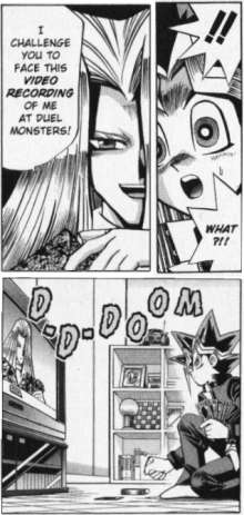 - Used by Pegasus in Yu-Gi-Oh!, although justified by the tape being cursed and actually allowing two-way communication.