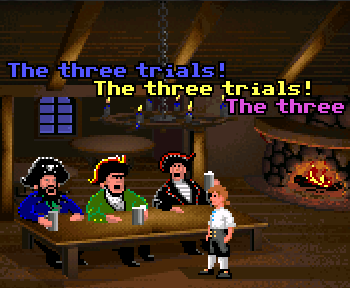 - Trope namer, the Three Trials in The Secret of Monkey Island: Swordplay, thievery and treasure-huntery.