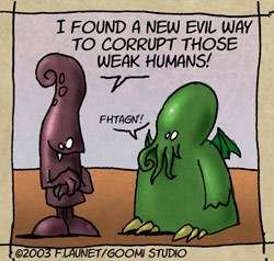 - Running Gag: Lots of them. Cthulhoo's gluttony, the Shoggies' stupidity, cultists getting eaten, etc. Not to mention people summoning Cthulhoo by accident every couple of strips.