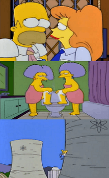 - To try to keep from being aroused by a sexy new coworker, Homer Simpson imagines his disgusting sisters-in-law Patty and Selma wearing towels and shaving their legs in the bathroom as well as his best friend Barney Gumbel in a polka-dot bikini drunkenly humming the theme to I Dream of Jeannie. Doesn't work, as Barney morphs into the sexy worker. His mantra is the Trope Namer.