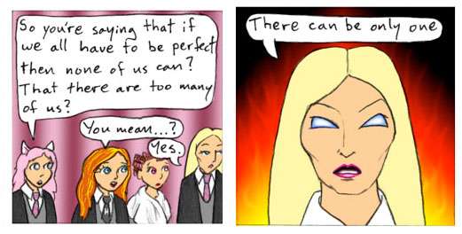 Parody Sue is usually this done deliberately, although it can become hard to tell it was supposed to be a joke. Parodies of multiple types of Sue tend to turn into a bloodbath (see page picture), as there's usually only room for one. And the above example raises a kind of interesting question: When everyone is a Mary Sue, would they cancel each other out? Or would the universe implode? The idea that they cancel each other out is one of the major rationales behind this trope. After all; if everyone is a Sue who can complain?
