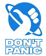 - In The Hitchhiker's Guide to the Galaxy, the Guide's major selling point besides cheaper price compared to the older, more complete and more accurate Encyclopedia Galactica is the words "Don't Panic" printed in large, friendly letters on its cover. A revised edition of the Guide in Mostly Harmless ominously replaces these reassuring words with small, alarming letters just saying "Panic." It turns out to be a very apt warning.