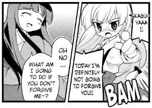 - When Kagura almost lets slip to Tohru about Kyo's true form, Kyo covers her mouth and says "If you utter another word, I'll never forgive you!". In response, Kagura yanks Kyo's arm behind him and says "Oh you won't forgive me will you?!".
