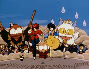 - Ranma ½, too many times to count. One such chase scene takes form under the opening credits for the first Ranma movie (called Big Trouble in Nekonron, China in North America) and lasts five minutes or more of screen time; it starts with a single person chasing Ranma, and slowly builds up until it seems that the entire city of Tokyo is on his heels. The Herd is also rife with cameos from the television series and manga.