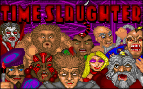 Under the frankly ugly graphics, the core of Timeslaughter is surprisingly good if you consider it was made by just two people. A shareware Fighting Game offering multiparallax backgrounds, 3D floors, a ton of digitized speech, blood that stayed on the ground, visible damage on the fighters, several levels of difficulty and speed... and was also quite smooth to play, wasn't really something you saw all days on DOS in the mid 1990s, unless you were dealing with the official conversions of Super Street Fighter II Turbo and the earlier episodes of Mortal Kombat.