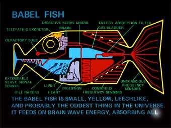 - The Hitchhikers Guide to The Galaxy uses the Babel Fish, though in this case the ridiculous nature of the translation device (inserted in the ear) probably means its use is satirical—like most things in H2G2. The fish itself, of course, is named after the biblical Tower of Babel myth.