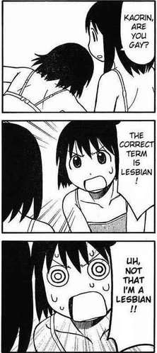 - In Azumanga Daioh, it's dead obvious that Kaorin has the hots for Sakaki, although she tries to play it off. It gets a massive Lampshade Hanging from Osaka in the 10th anniversary comics (see the page pic).