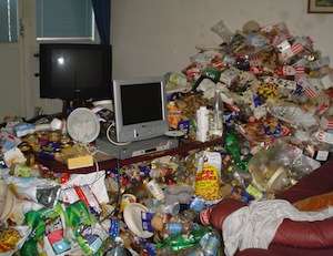 Compare Men Can't Keep House, The Pig Pen, It Came From the Fridge, Down in the Dumps. For the opposite behavior, see Neat Freak.
