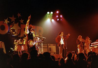 Trooper live in '75. Left to right: Tommy Stewart (view blocked), Brian Smith, Ra McGuire, Doni Underhill, and Frank Ludwig