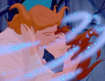 - The kiss shown in the page image occurs in Beauty and the Beast, after Belle's Dying Declaration of Love resurrects the Beast as a human prince. Their kiss transforms the castle's servants back into humans.