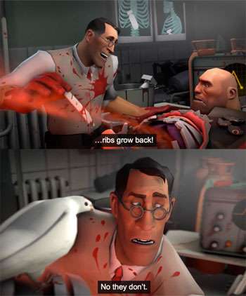- In the Team Fortress 2 video "Meet The Medic", the Medic tells the Heavy that "Ribs grow back". Then he whispers to his dove: "No they don't." [1]